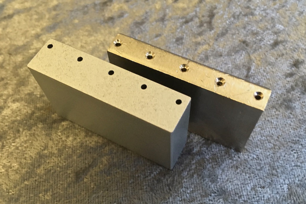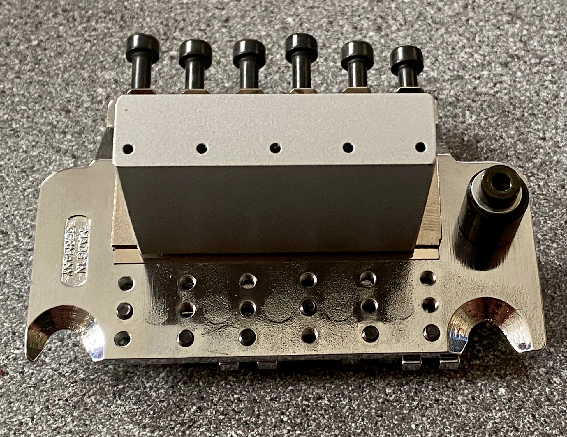 Having experimented with many older Floyd Rose vibrato units and discovered that some of the earlier ones had blocks made of steel and that these bridges had a different sound with a tight defined bass and a controlled fatness and a keen treble edge, it led us to have some blocks made from Cold Rolled Steel>