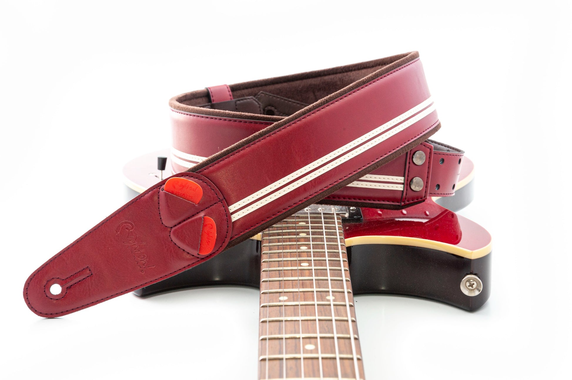 Pick holder located in the tail of the strap. They are 3 simple cuts to introduce the plectrums, allowing faster and more intuitive access to them.