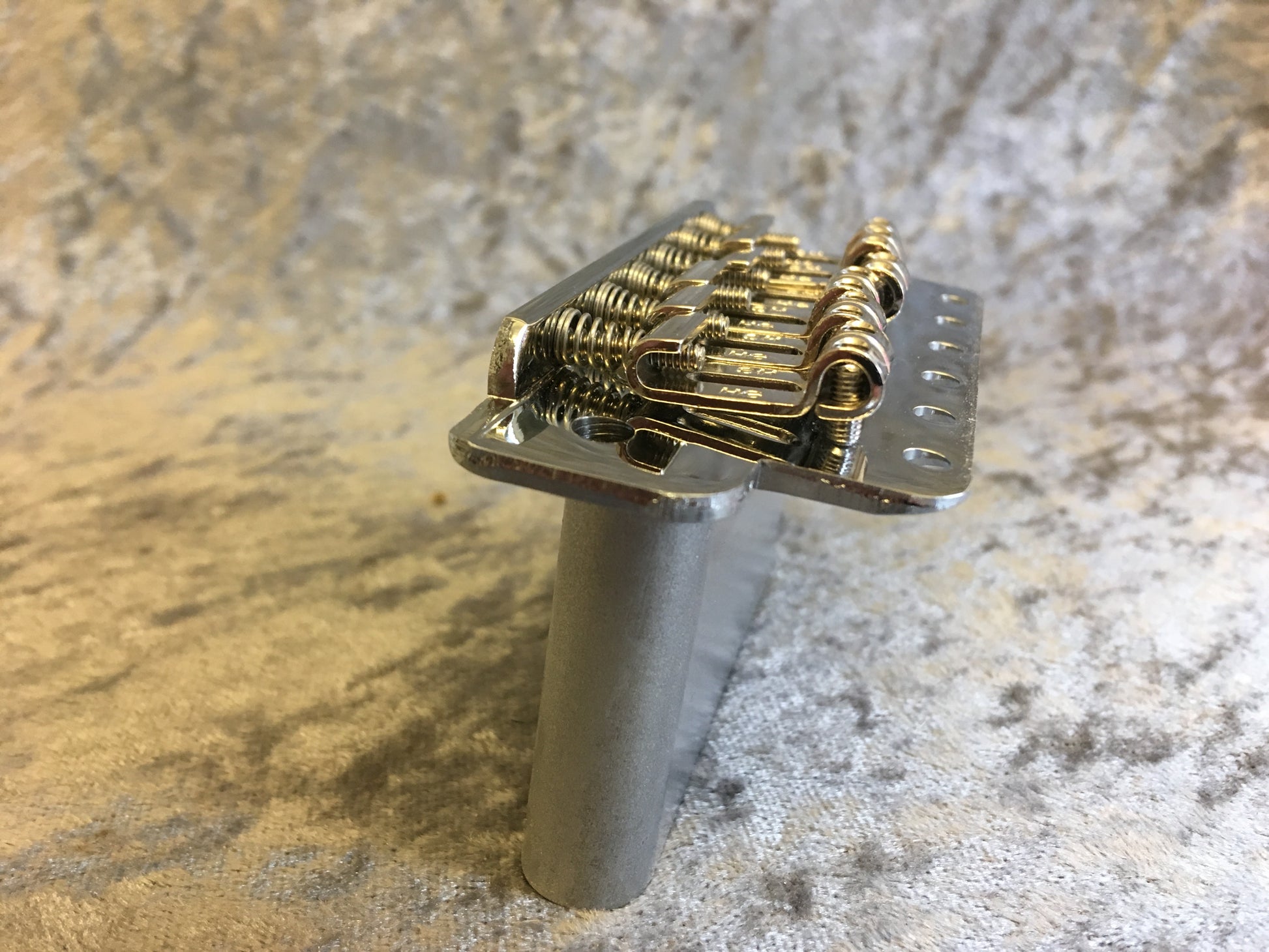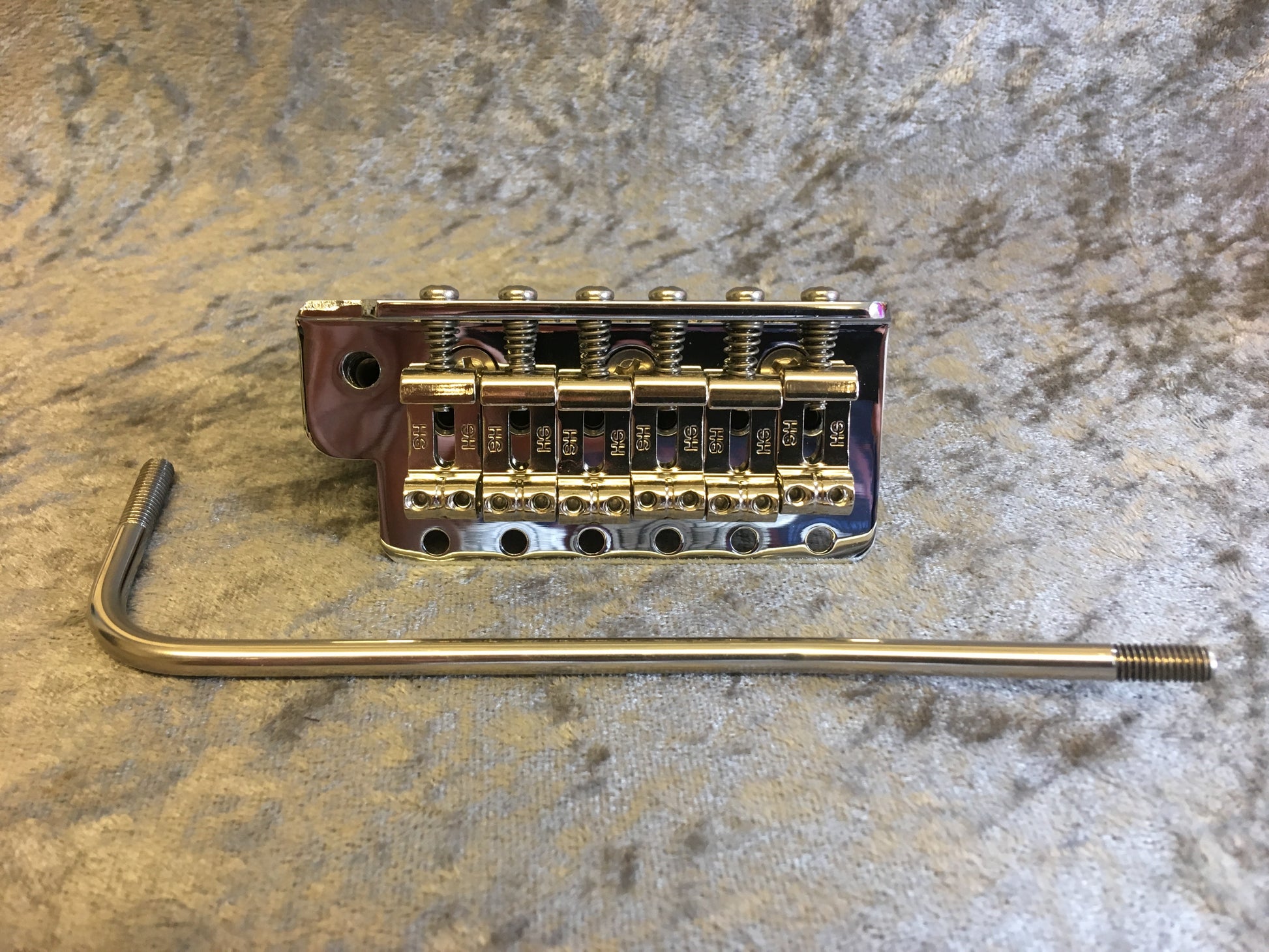 This is a model of tremolo that mounts normally on a vintage stratocaster but converts to a narrower Gibson like spacing to help where a narrow neck means the strings are prone to slipping off the edge of the neck.