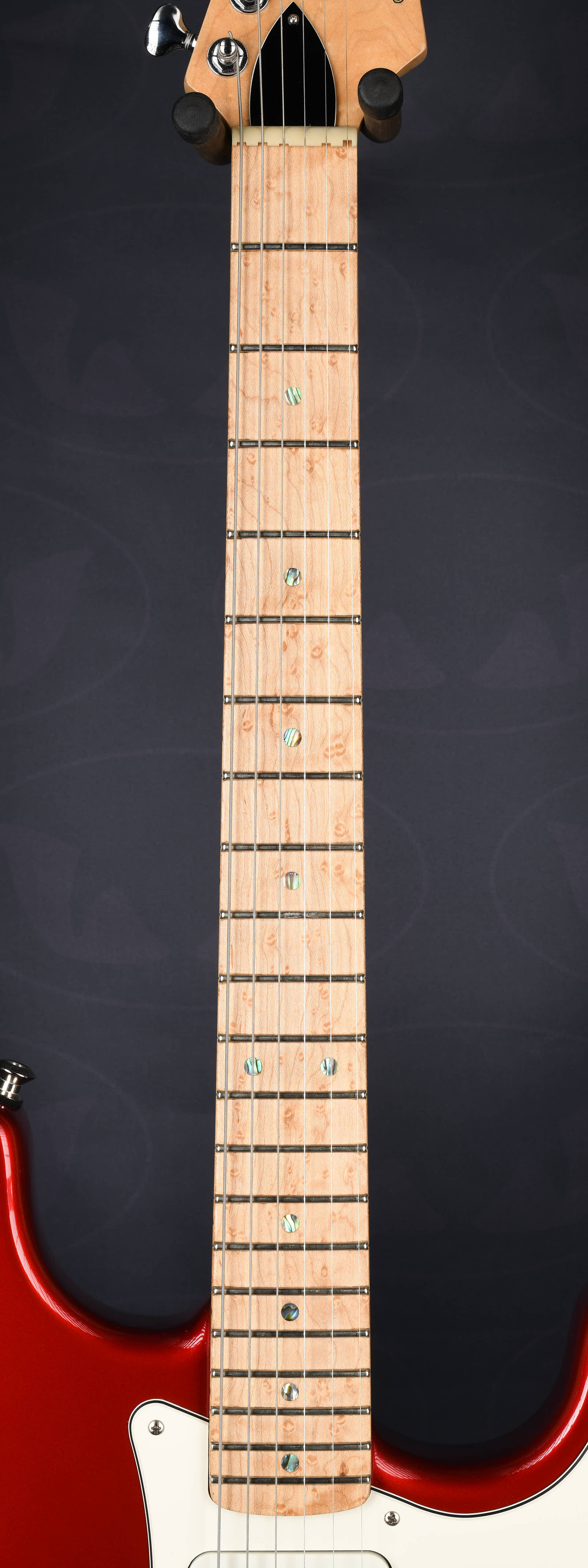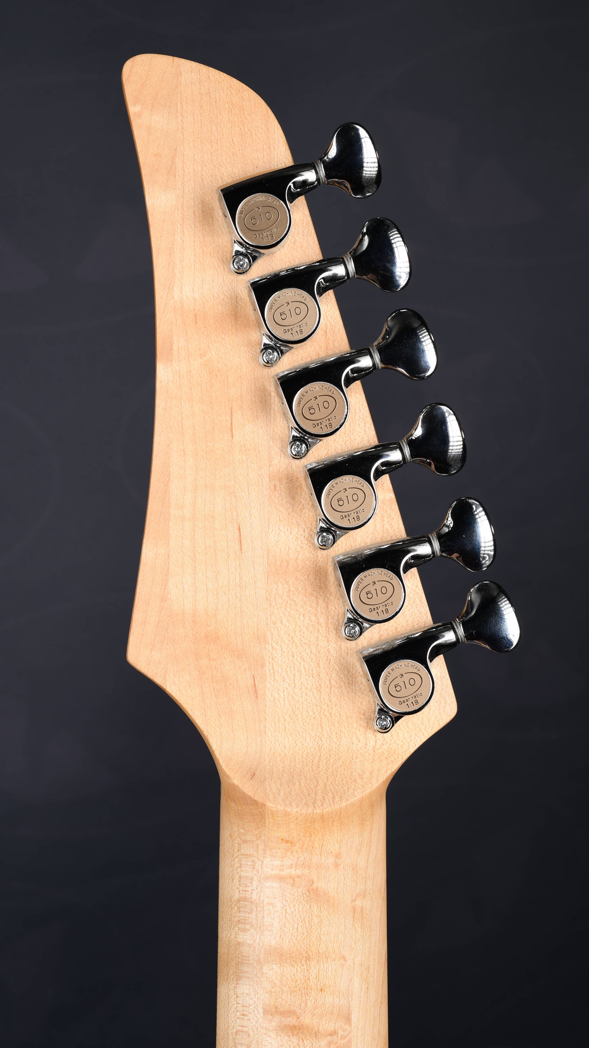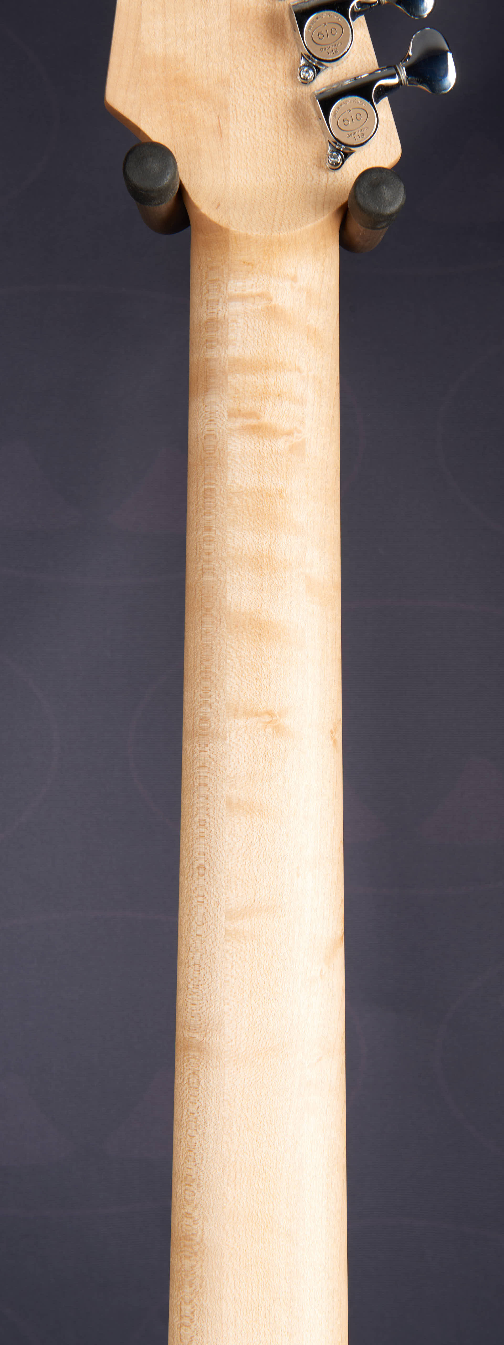 An alder body paired to a 3 piece quarter-sawn neck with maple board with abalone dot inlays and Dunlop 6155 frets