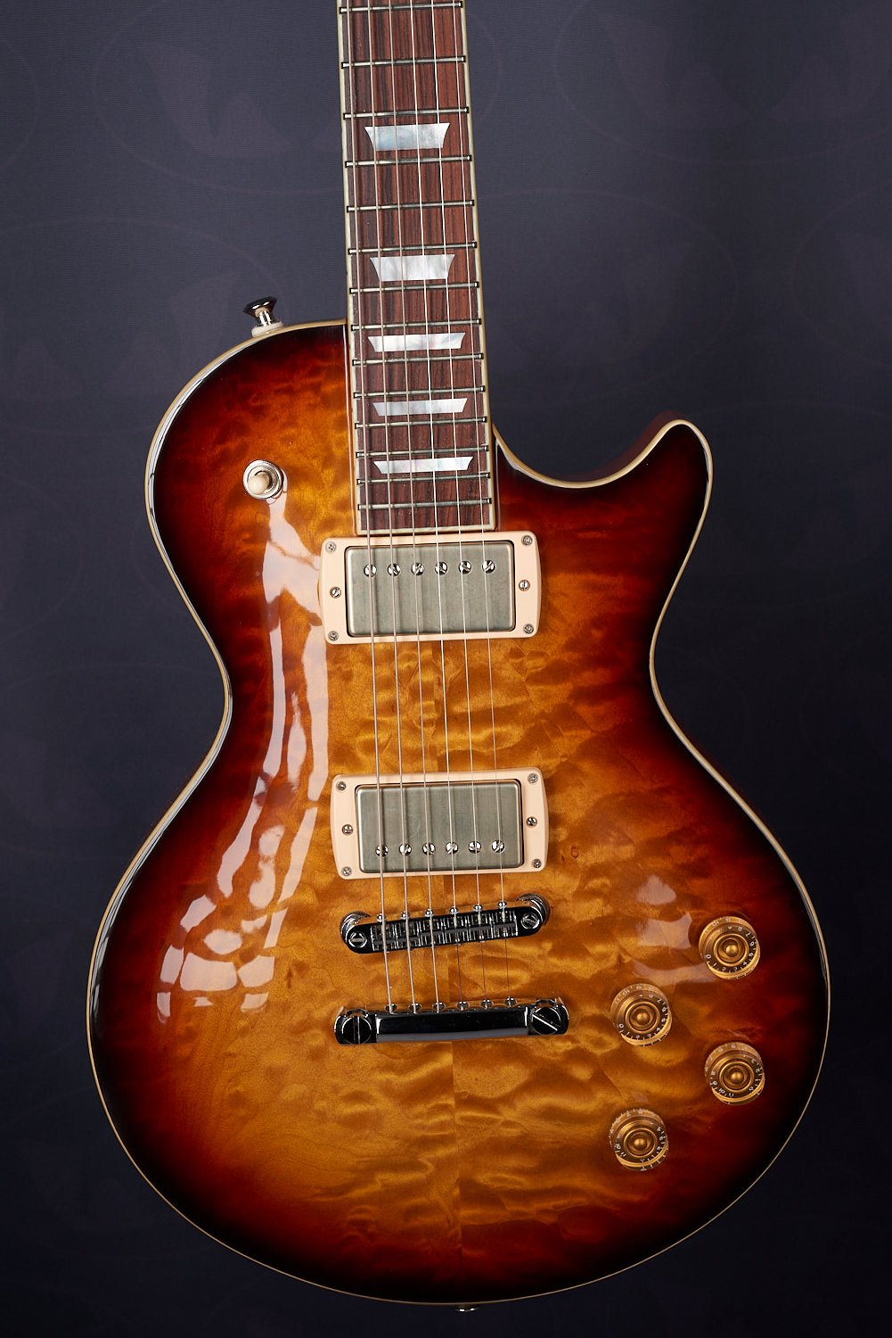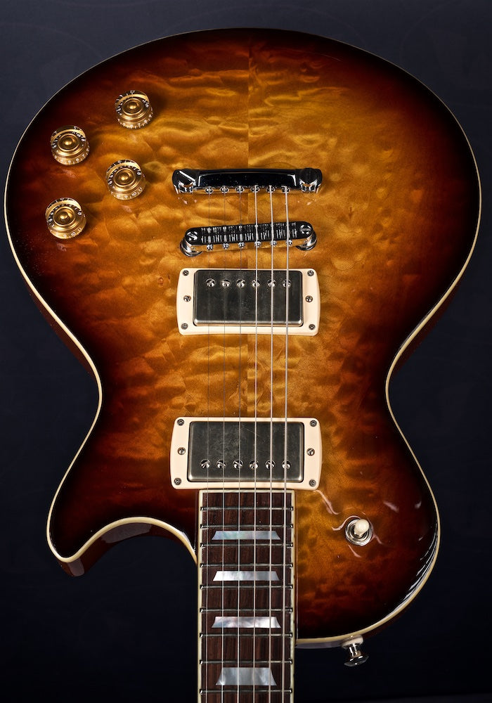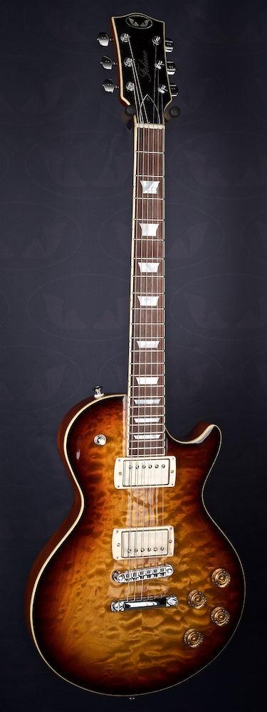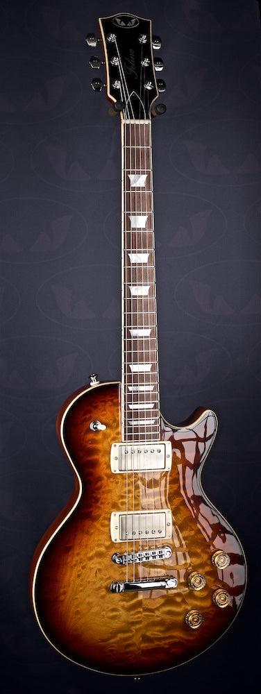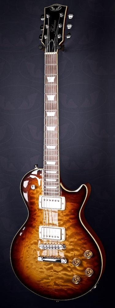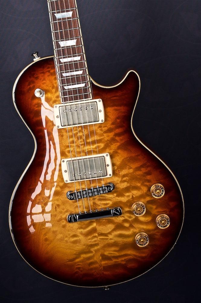 A lovely 3 tone burst over quilt with some Cream T Whiskerbucker pickups for the authentic Billy Gibbons Pearly Gates Texas Blues tone.
