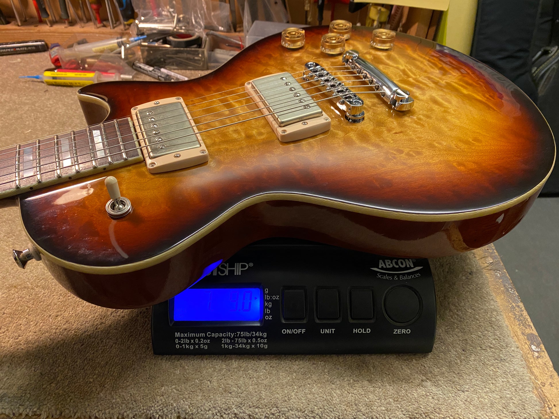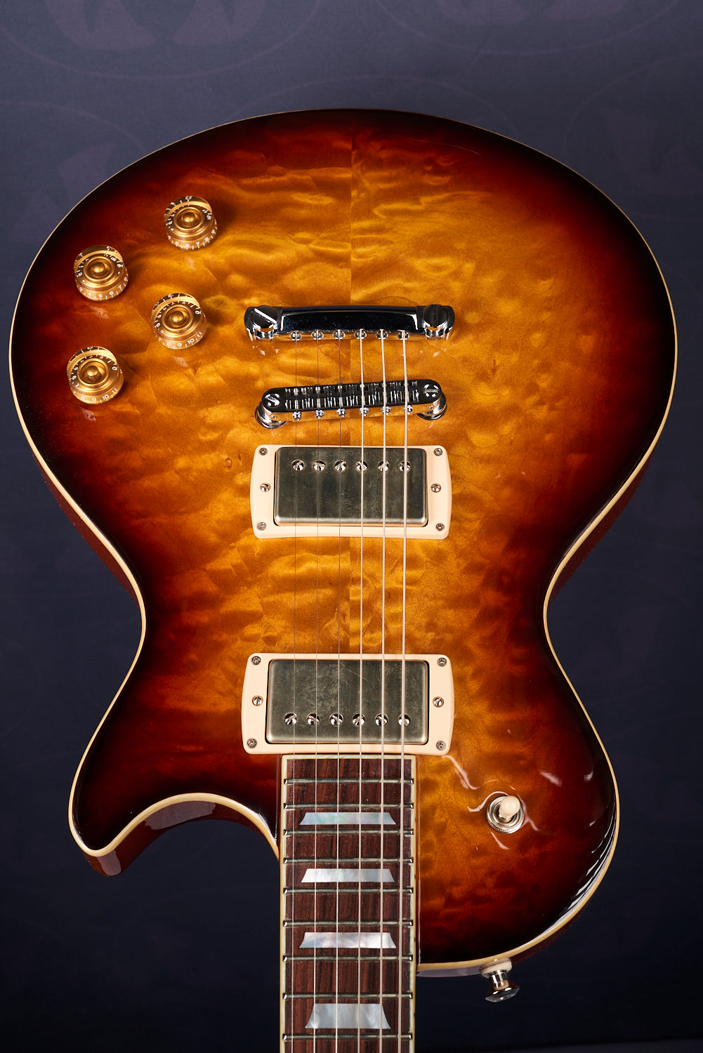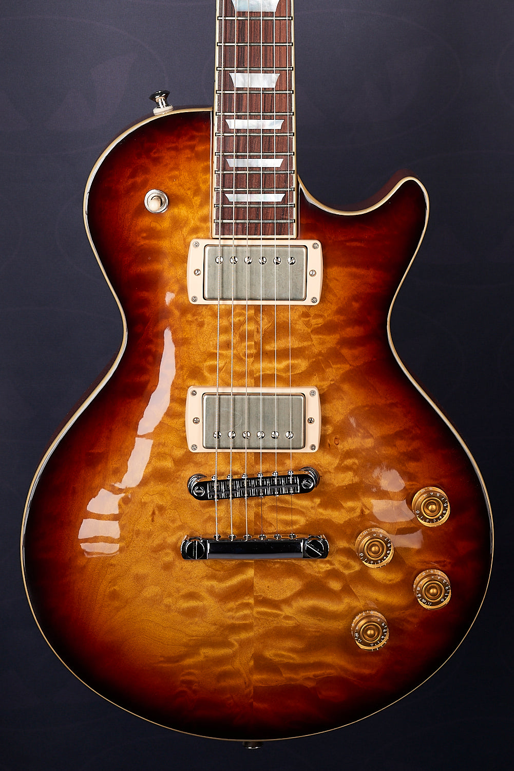 A lovely 3 tone burst over quilt with some Cream T Whiskerbucker pickups for the authentic Billy Gibbons Pearly Gates Texas Blues tone.