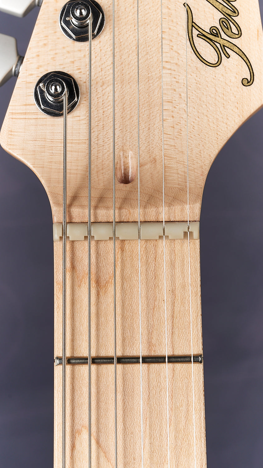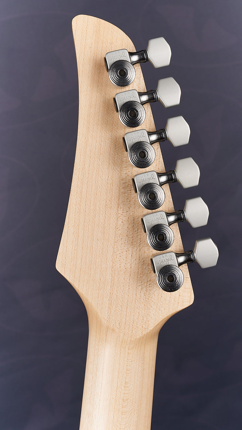 Hardware includes Sperzel locking tuners and a clever Gotoh/Wilkinson bridge with clever twisting saddles fo great intonation.