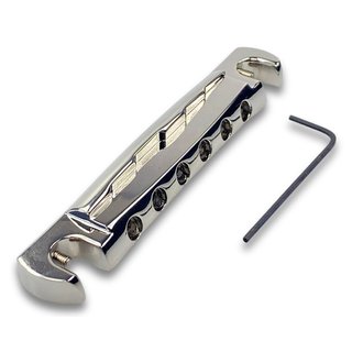 Lightweight aluminum compensated wraparound tailpiece based on a historic correct '59. Tired of playing only to the 7th fret? This is the solution! Put one on your vintage guitar to get perfect intonation, while storing and preserving your original. Allen screws on both sides, comes with Allen wrench for adjustments. Nickel glossy finish.